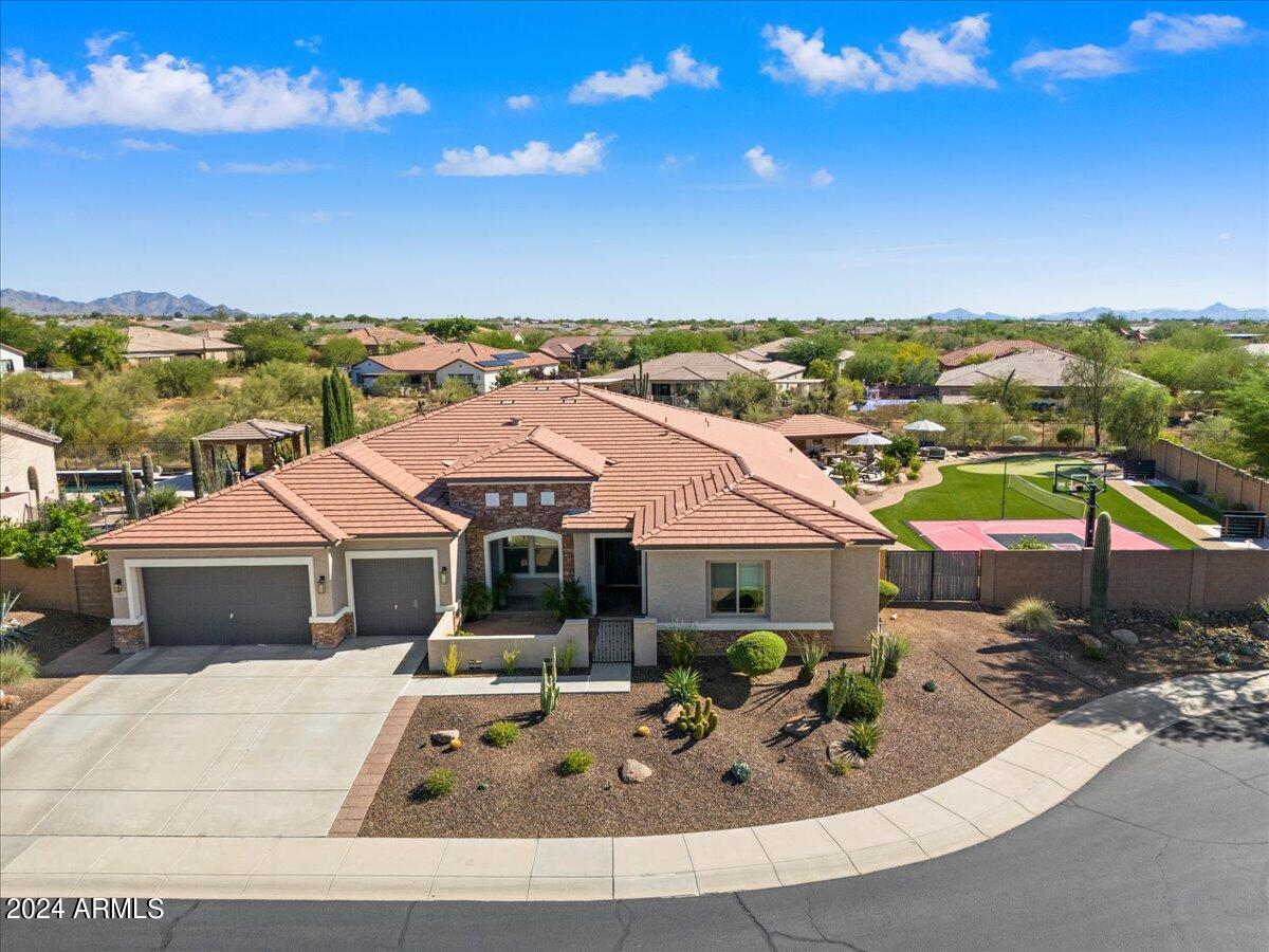 This stunning, extensively upgraded home sits on an expansive cul-de-sac lot and offers a true entertainer's paradise. Located in the exclusive, gated Lone Mountain Palisades Subdivision, this property presents a rare opportunity to own one of the best lots in the community. This home offers 5 bedrooms plus a den with 4.5 bathrooms all spread over 4,025 square feet of living space. Step into a backyard retreat featuring a 50,000-gallon heated pool and spa, equipped with a state-of-the-art wireless Pentair system. Enjoy the waterslide, waterfall, grotto, splash pad, swim-up bar, and dramatic fire bowls that frame this oasis. The sunken ramada comes complete with an outdoor kitchen, BBQ, TV, and seating area, while additional features include an outdoor fireplace and fire pit. The backyard also boasts a putting green, walking path, regulation horseshoe pits, and a custom sport court. Inside, every bedroom offers custom-built closets, with dual closets in the master. The chef's kitchen, equipped with premium Wolf appliances, opens to a magnificent great room featuring a fireplace and expansive stacked sliding doors, blending indoor and outdoor living seamlessly. The kitchen is adorned with stunning cabinetry, including glass-lit upper cabinets for added elegance. The luxurious master bath offers a massive shower with multiple shower heads and a tub inside. The attached casita, perfect for guests or extended family, includes a separate entrance, living area, kitchenette, and an additional bedroom with a walk-in closet and full bath. With a three-car garage and ample built-in storage solutions, this home is as practical as it is luxurious. Don't miss your chance to own this one-of-a-kind property!