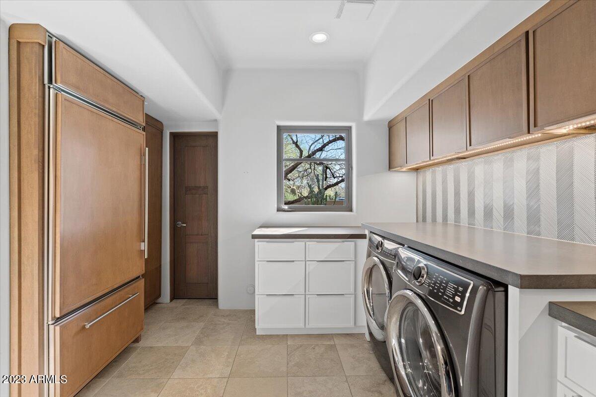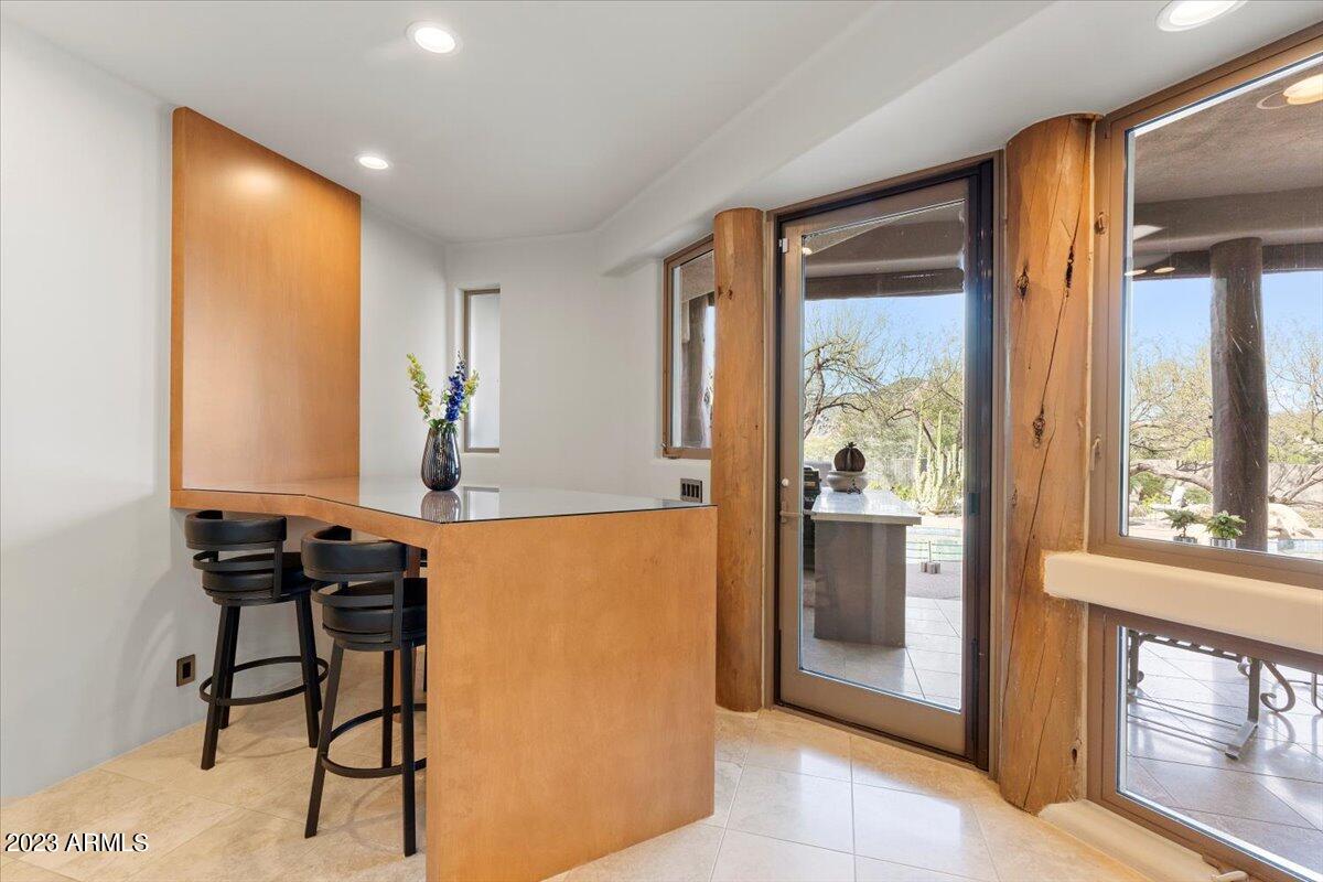 Nestled on a premium 1.2 acre cul-de-sac lot in the desirable, gated community of The Boulders, this beautiful soft contemporary estate boasts an array of upgrades which include custom iron gate entry doors, energy efficient windows, newly painted interior and exterior, newer roof, new exterior landscape lighting, and new reverse osmosis water system. Upon entry, you are greeted by high, wood beam ceilings, plenty of natural light, and sleek travertine floors that seamlessly flow through the main living areas. The luxurious kitchen features custom built cabinets with roll-out shelves, custom backsplashes, custom wood paneled SubZero refrigerator, bar cabinet that hosts the wine fridge, Scotsman ice machine, granite counters with ample counter space, and new Wolf stainless steel appliances. The eat-in kitchen showcases a custom made waterfall wood table. The primary suite offers his/her vanities, his/her walk-in closets, sizable tiled walk-in shower, jetted tub, gas fireplace, and private access to the backyard amenities which include a covered travertine patio, built-in BBQ area, a sparkling, heated pool & spa, glass stone filled fire pit, and access to the second level balcony. Split from the primary suite is a guest bedroom with en-suite bath, and located on the main level is an attached casita that includes a new beverage center, full bath, and dining area. On the second level you will find the home office with built-in cabinets, a guest bedroom and full guest bath. Through the glass sliding doors, you and your guests can enjoy the large covered balcony that features built-in heaters, gas fireplace, and sweeping mountain views.